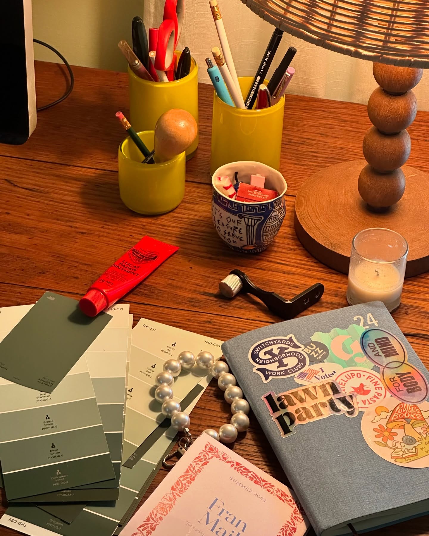 When I migrate from the kitchen island to my actual office is when it’s time to Go To Work. I plug my laptop into my big screen and have my Wacom tablet set up there, and I turn on my two cozy desk lamps. If it really is feeling like drudgery to get my ass in the chair, I will light a candle and pretend as if that alone will imbue me with the power to get to business.